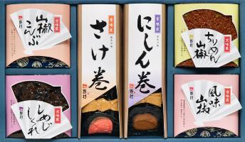 【全国送料無料】野村佃煮 京味匠価格: 5,250円レビュー評価: 0.0 レビュー数:0 風味山椒・山椒昆布・しめじしぐれ・ふきしぐれ・茸茶漬 各50g、ちりめん山椒30g、さけ巻・にしん巻・ごぼう巻・たらこ巻 各1本 |